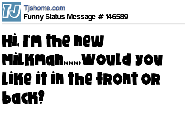 X Hi, I'm the new Milkman,,,,,,,Would you like it in the front or back?