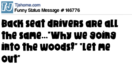 - # 165336 Back seat drivers are all the same. It's always "This isn't the way to my house.", "Why are we going into the woods?" and "Stop the car and let me out."