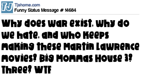 X is Why does war exist, why do we hate, and who keeps making these Martin Lawrence movies? Big Mommas House 3? Three? WTF