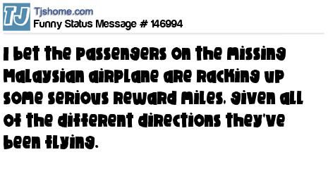 X says I bet the passengers on the missing Malaysian airplane are racking up some serious reward miles, given all of the different directions they've been flying.