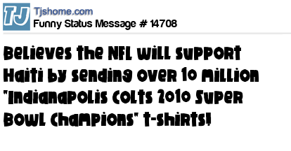 X believes the NFL will support Haiti by sending over 10 million "Indianapolis Colts 2010 Super Bowl Champions" t-shirts!