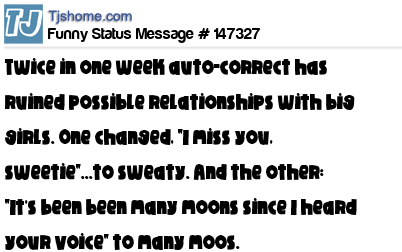 X Twice in one week auto-correct has ruined possible relationships with big girls. One changed, "I miss you, sweetie"...to sweaty. And the other: "It's been been many moons since I heard your voice" to many moos.