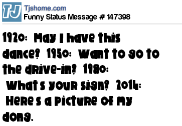 - # 127708 1920: "May I have this dance?" 1950: "Want to go to the drive-in?" 1980: "What's your sign?" 2012: "Here's a picture of my p eni$."