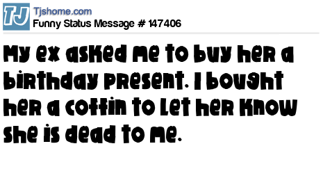 X says My ex asked me to buy her a birthday present. I bought her a coffin to let her know she is dead to me.
