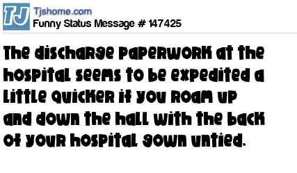X says The discharge paperwork at the hospital seems to be expedited a little quicker if you roam up and down the hall with the back of your hospital gown untied.