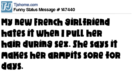 X says My new French girlfriend hates it when I pull her hair during sex. She says it makes her armpits sore for days.