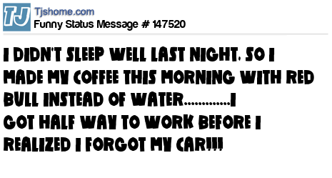 X says I DIDN'T SLEEP WELL LAST NIGHT, SO I MADE MY COFFEE THIS MORNING WITH RED BULL INSTEAD OF WATER.............I GOT HALF WAY TO WORK BEFORE I REALIZED I FORGOT MY CAR!!!