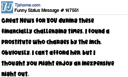 X says Great News for YOU during these financially challenging times. I found a prostitute who charges by the inch. Obviously, I can't afford her, but I thought you might enjoy an inexpensive night out.