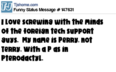 - # 189940 I love screwing with the minds of the foreign tech support guys. "My name is Perry, not Terry. With a P as in Pterodactyl."