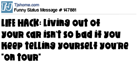 X says LIFE HACK: Living out of your car isn't so bad if you keep telling yourself you're "on tour"