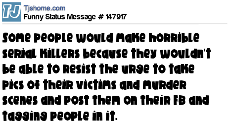 X says Some people would make horrible serial killers because they wouldn't be able to resist the urge to take pics of their victims and murder scenes and post them on their FB and tagging people in it.