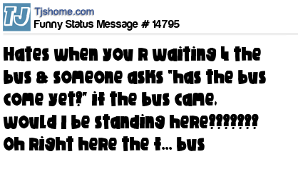 - # 173095 When I'm waiting for the bus I hat it when someone asks "Has the bus come yet?" ...... Hey dummy .... If the bus came, would I still be standing here???