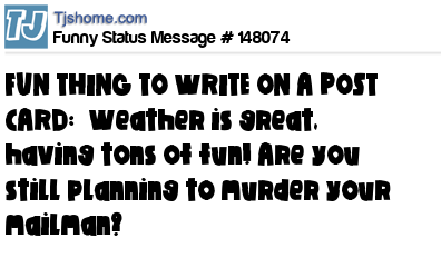 - # 109075 FUN THING TO WRITE ON A POST CARD: "Weather is great, having tons of fun! Are you still planning to murder your mailman?"