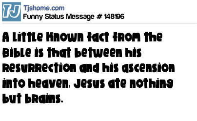 X says A little known fact from the Bible is that between his resurrection and his ascension into heaven, Jesus ate nothing but brains.