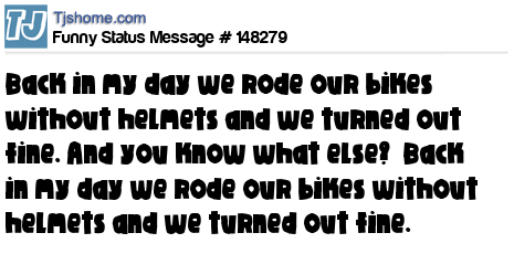 X says Back in my day we rode our bikes without helmets and we turned out fine. And you know what else? Back in my day we rode our bikes without helmets and we turned out fine.