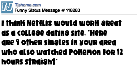 X says I think Netflix would work great as a college dating site. "Here are 9 other singles in your area who also watched Pokemon for 12 hours straight"