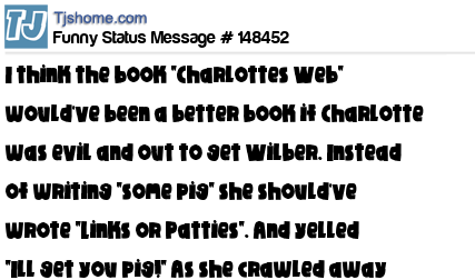 X says I think the book "Charlottes Web" would've been a better book if Charlotte was evil and out to get Wilber. Instead of writing "some pig" she should've wrote "Links or Patties". And yelled "Ill get you pig!" As she crawled away