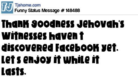 X says Thank goodness Jehovah's Witnesses haven’t discovered Facebook yet. Let’s enjoy it while it lasts.