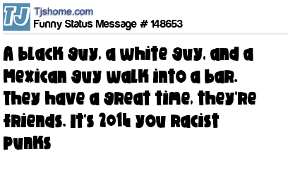X A black guy, a white guy, and a Mexican guy walk into a bar. They have a great time, they're friends. It's 2014 you racist punks