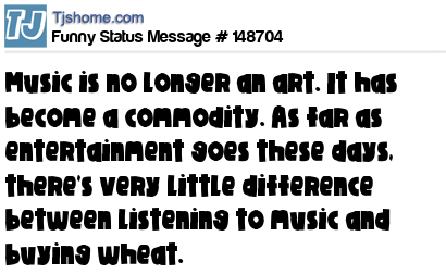 X Music is no longer an art. It has become a commodity. As far as entertainment goes these days, there's very little difference between listening to music and buying wheat.