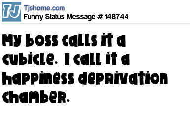 X says My boss calls it a cubicle. I call it a happiness deprivation chamber.