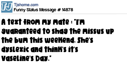 X A text from my mate : "I'm guaranteed to shag the missus up the bum this weekend. She's dyslexic and think's it's Vaseline's Day."