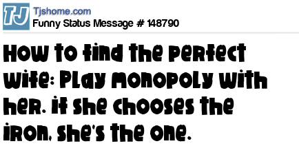 X How to find the perfect wife: Play monopoly with her. if she chooses the iron, she's the one.