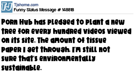 X says Porn Hub has pledged to plant a new tree for every hundred videos viewed on its site. The amount of tissue paper I get through, I'm still not sure that's environmentally sustainable.