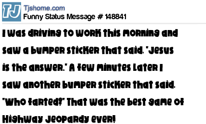X says I was driving to work this morning and saw a bumper sticker that said, "Jesus is the answer." A few minutes later I saw another bumper sticker that said, "Who farted?" That was the best game of Highway Jeopardy ever!