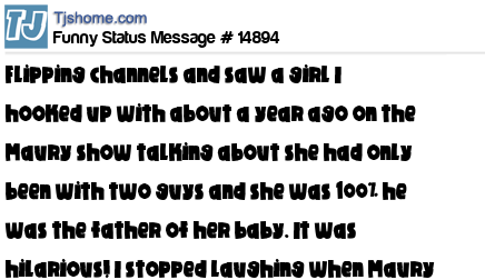 - # 24484 flipping channels and saw a girl I hooked up with about a year ago on the Maury show talking about she had only been with two guys and she was 100% he was the father of her baby. It was hilarious! I stopped laughing when Maury said you are not the father