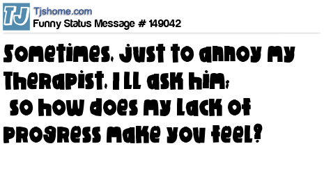 - # 158648 Sometimes just to annoy my therapist, I ask him, "So how does my lack of progress make you feel?"