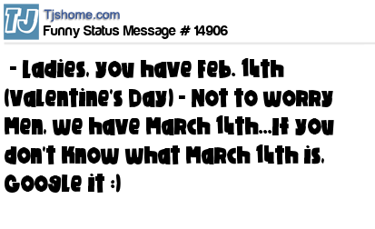 - # 46381 Today may be Valentines day, but men will get their revenge in exactly one month....March 14th, look it up.