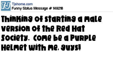 X says Thinking of starting a male version of the Red Hat Society. Come be a Purple Helmet with me, guys!