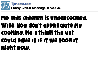 X says Me: This chicken is undercooked. Wife: You don't appreciate my cooking. Me: I think the vet could save it if it we took it right now.