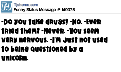 X says -Do you take drugs? -No. -Ever tried them? -Never. -You seem very nervous. -I'm just not used to being questioned by a unicorn.