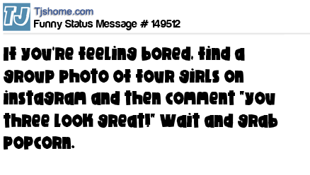 X says If you're feeling bored, find a group photo of four girls on instagram and then comment "you three look great!" Wait and grab popcorn.