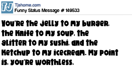 X says You're the jelly to my burger, the knife to my soup, the glitter to my sushi, and the ketchup to my icecream. My point is, you're worthless.