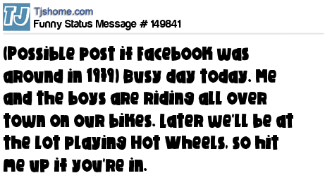 X (Possible post if Facebook was around in 1979) Busy day today. Me and the boys are riding all over town on our bikes. Later we'll be at the lot playing Hot Wheels, so hit me up if you're in.