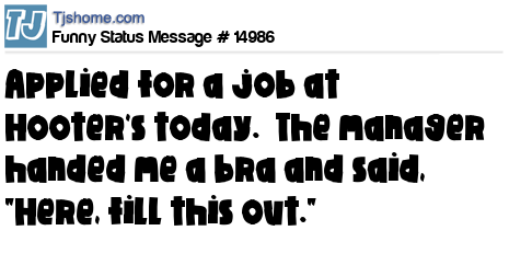 - # 158750 I always wondered what the job application is like at Hooters? Do they just give you a bra and say, "here fill this out"... 😀😳😜