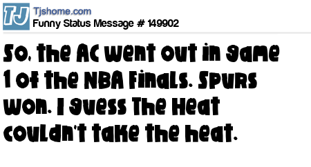 X So, the AC went out in game 1 of the NBA Finals. Spurs won. I guess The Heat couldn't take the heat.