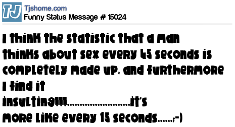 X says I think the statistic that a man thinks about sex every 45 seconds is completely made up, and furthermore I find it insulting!!!.........................it's more like every 15 seconds......;-)