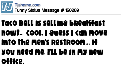 X Taco Bell is selling breakfast now?.. Cool, I guess I can move into the men's restroom... If you need me, I'll be in my new office.