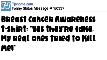 - # 33403 I saw a woman with a Breast Cancer Awareness t-shirt that said "Yes they're fake, My real ones tried to kill me!"