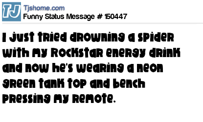 X says I just tried drowning a spider with my Rockstar energy drink and now he's wearing a neon green tank top and bench pressing my remote.