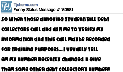 X says So when those annoying Student/Bill Debt collectors call and ask me to verify my information and this call maybe recorded for training purposes....I usually tell em my number recently changed, n give them some other debt collector's number! problem solved