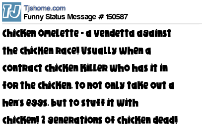X says Chicken Omelette - a vendetta against the chicken race! Usually when a contract chicken killer who has it in for the chicken, to not only take out a hen's eggs, but to stuff it with chicken! 2 generations of chicken dead!
