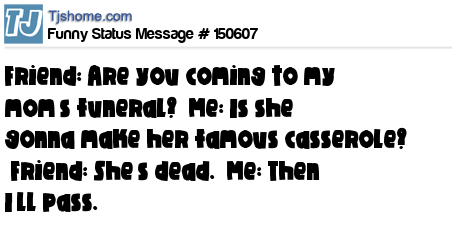 X says Friend: Are you coming to my mom’s funeral? Me: Is she gonna make her famous casserole? Friend: She’s dead. Me: Then I’ll pass.