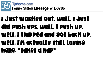 X says i just worked out. well, I just did push ups. well, 1 push up. well, I tripped and got back up. well, I'm actually still laying here. *takes a nap*