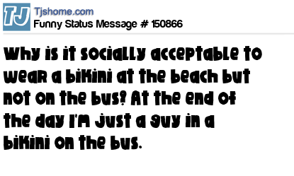 X says Why is it socially acceptable to wear a bikini at the beach but not on the bus? At the end of the day I'm just a guy in a bikini on the bus.