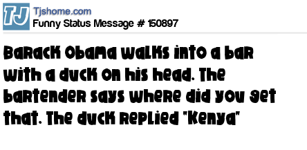 X Barack Obama walks into a bar with a duck on his head. The bartender says where did you get that. The duck replied "Kenya"